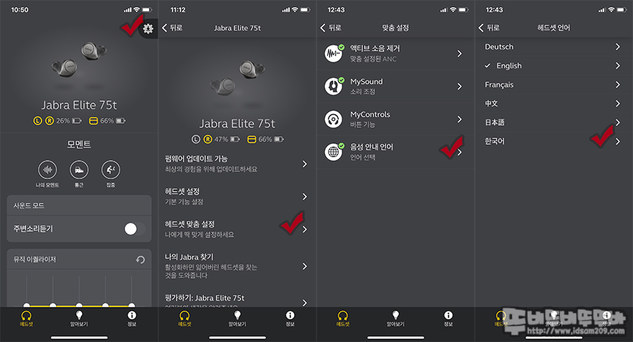 자브라 엘리트 75t 제품을 개봉 후 착용하게 되면 기본 영어로 음성안내를 하게 되는데요.