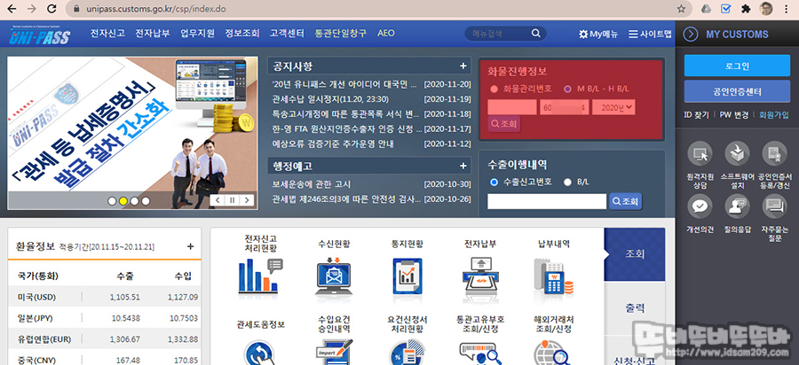 유니패스 사이트에 접속하여 사진상에 빨간 사각형 영역의 "화물진행정보"에 M B/L - H B/L를 선택하고 중간에 트래킹 번호 13자리를 입력 후 검색을 합니다.