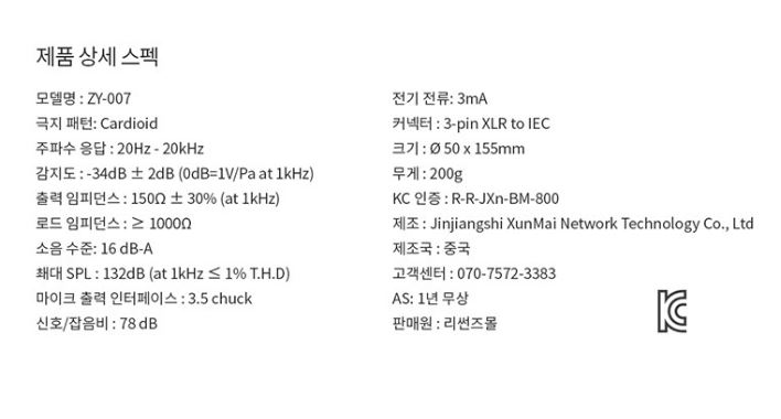 ZINGYOU ZY-007 콘덴서는 마이크 사용 시 펜텀 파워가 필요한 상황이라면 유통상인 (주)리썬즈몰에 문의하여 구입하시기 바랍니다.
