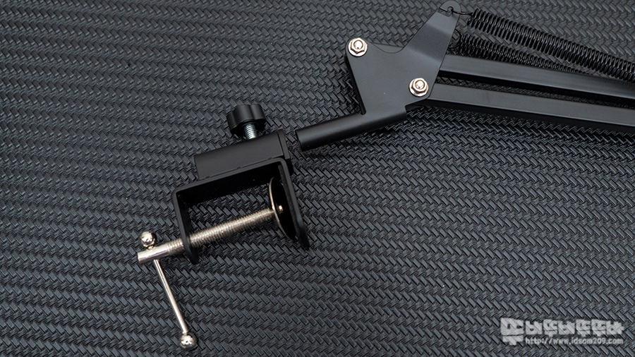 책상 고정용 클램프는 최대 480mm 두께의 상판에 장착이 가능하며 마이크 스탠드 결합 후 뒤쪽의 조임 나사를 이용하여 마이크 스탠드의 좌우 움직임을 고정할 수 있게 디자인되었습니다.