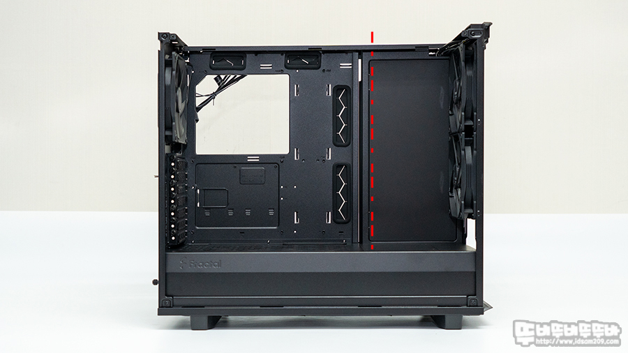 Fractal Design Meshify 2의 내부는 보통의 ATX 메인보드가 장착되는 미들타워 구조(빨간 점선)에서 조금 확장된 디자인으로 앞뒤가 길다라고 생각할 수 있는데 앞쪽의 공간은 HDD가 장착되는 공간 또는 수냉 튜닝 시 펌프 마운드를 놓을 수 있는 공간을 활용할 수 있어 활용도가 좋은 편입니다.