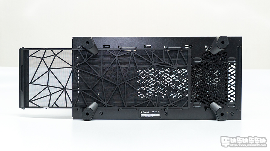 바닥면의 슬라이딩 방식으로 탈부착하는 먼지 필터와 케이스를 지탱하는 튼튼한 케이스 다리 모습.