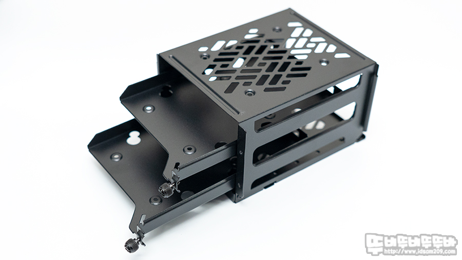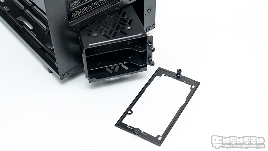 하드 베이는 파워서플라이 가이드를 분리 후 사진과 같은 방향으로 꺼낼 수 있으며 기본으로 제공되는 2개의 가이드를 활용하여 SSD 또는 HDD 장착이 가능합니다.