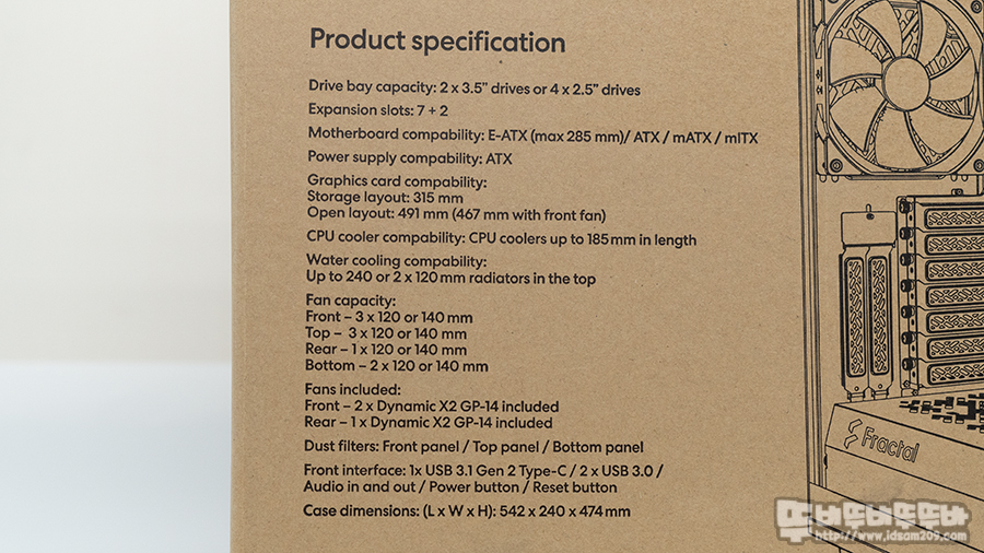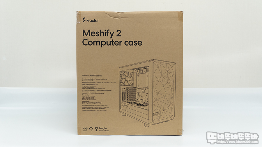패키지 앞뒤면은 Fractal Design Meshify 2 스펙 정보와 특징이 인쇄된 내용으로 제품의 세부적인 디자인을 확인할 수 있게 디자인되었습니다.