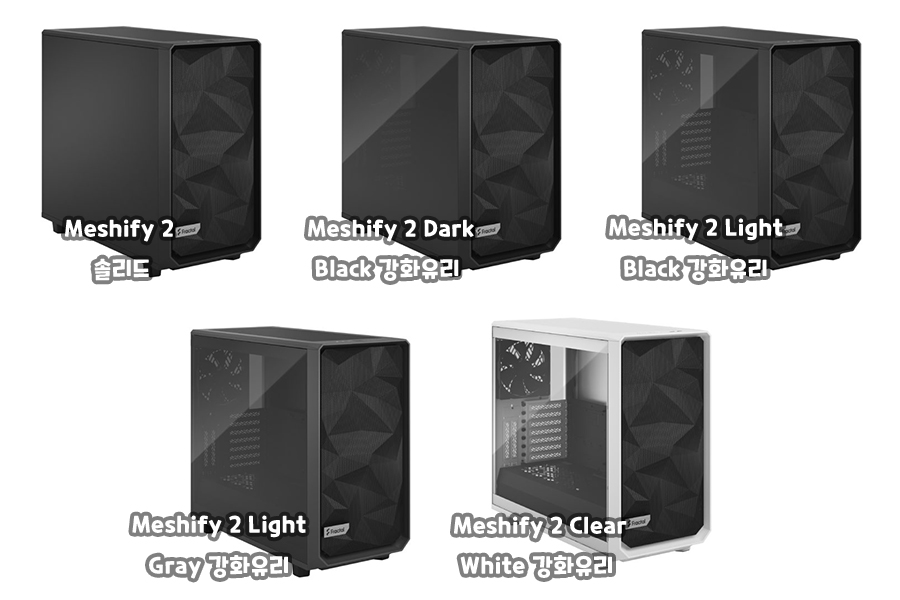 다양한 구성으로 판매되고 있는 미들타워 케이스인 Fractal Design Meshify 2 시리즈는 메탈 재질의 사이드 패널을 사용한 솔리드 제품과 강화유리가 사용된 블랙(다크, 라이트 강화유리), 그레이, 화이트는 라이트 강화유리 제품으로 빅타워 디자인의 XL 시리즈는 블랙 다크, 라이트 강화유리 버전으로 출시되어 취향에 따른 다양한 제품 선택이 가능한 게 플렉탈디자인만의 특징입니다.