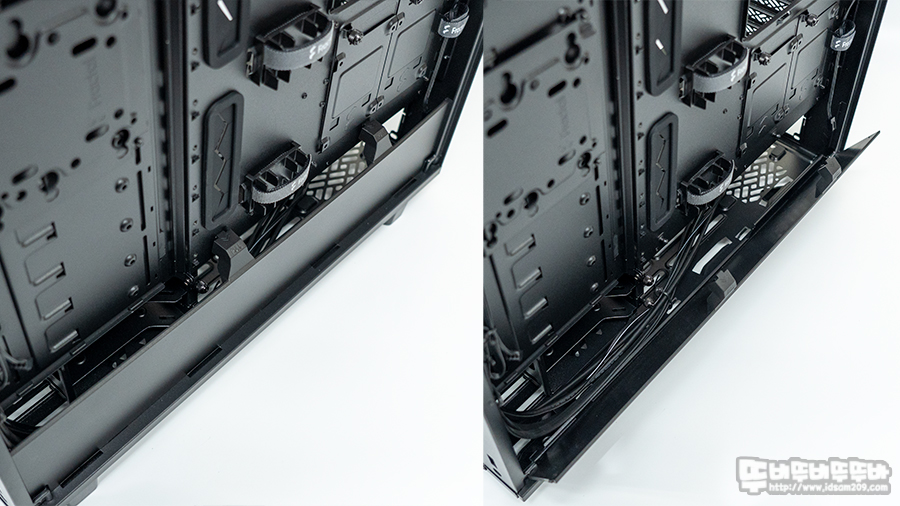 케이스 바닥면의 먼지 필터를 분리하고 샤시에 고정된 하드 베이의 고정 나사를 분리하면 파워서플라이를 장착하는 공간을 제외한 공간 내에서 이동 또는 하드 베이를 추가로 구입 시 추가로 장착이 가능합니다.