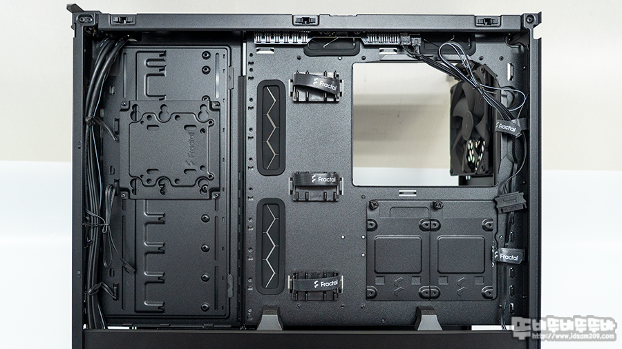 샤시 앞쪽에는 서버 빌드 시 HDD 가이드가 장착되는 이동식 가이드와 정사각형 모양의 멀티 브라켓은 HDD/SSD 장착 또는 수냉 시스템 구축 시 펌프 마운드로 활용이 가능하며 중앙에 밸크로 타이 사용된 케이블 가이드와 샤시면에 부착된 2개의 SSD 가이드 그리고 케이스 상단의 Nexus + 2 팬 허브 모습을 확인할 수 있는데요.