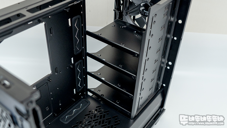 케이스 중앙과 끝 부분에 기본 장착된 케이블 가이드 덕에 깔끔한 케이블 정리가 가능했으며 하단 챔버 부분의 커버를 이용하면 케이스 하단에 지저분하게 보이는 케이블들이 깔끔하게 보이이게 됩니다.