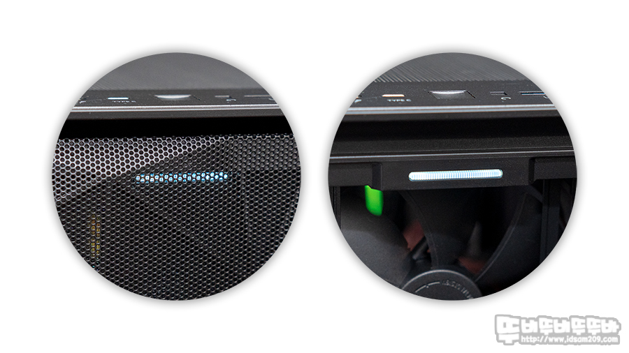 시스템 조립 시 전원 LED 커넥터를 연결했는데 LED를 어디서 확인하지 하고 살펴보다 보니 전면 메쉬 그릴 안쪽에 위치한 LED 모습을 확인할 수 있었는데요. 있는 듯 없는 듯 보이는 화이트 LED가 괜찮아 보였습니다.