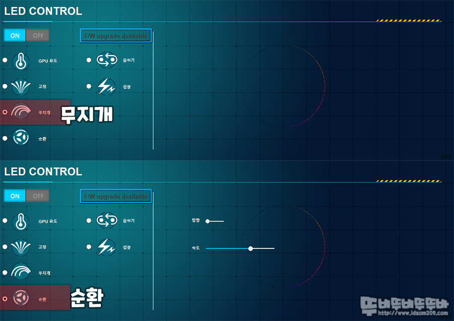 레인보우 효과와 자동을 순환하는 효과, 지정된 컬러로 숨쉬기를 표현하는 효과와 섬광 효과까지 취향 맞는 효과로 VGA카드를 화려하게 표현할 수 있습니다.