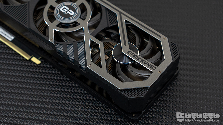 암페어 시리즈의 특징이 VGA카드 중앙에 위치한 8 + 8핀 보조전원 소켓은 PCB 위치상으로는 기판의 끝부분인 거 같은데 히트싱크와 쿨링팬 디자인으로 인해 중앙에 위치한 느낌 들며 쿨링팬 커버는 쿨링팬이 히트싱크 냉각 후 공기가 VGA 카드 내에 머물르지 않게 위/아랫부분을 오픈하여 공기 순환이 될 수 있게 디자인되었습니다.