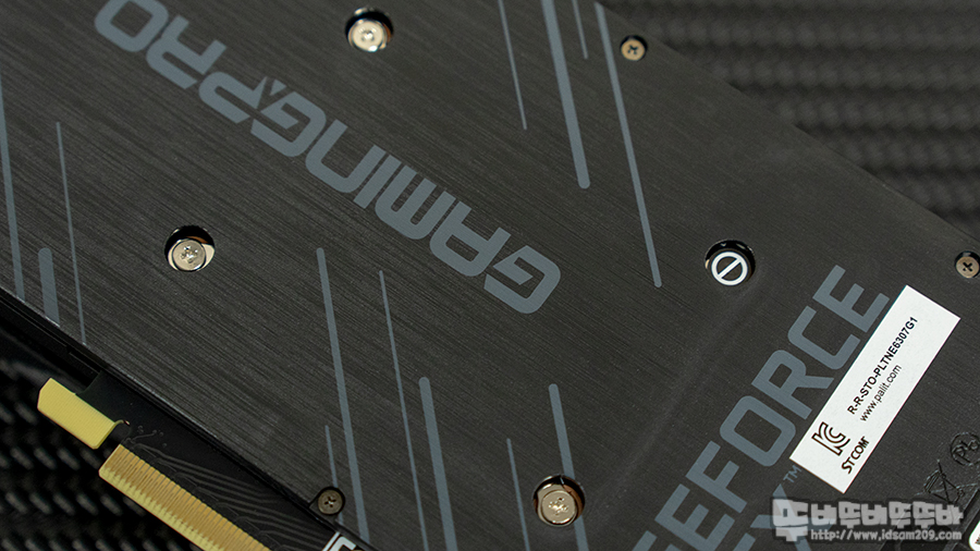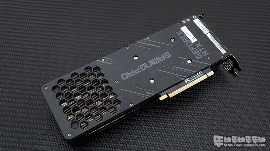 메탈 소재가 아닌 플라스틱 소재가 사용된 백플레이트 VGA카드 후면에 허니컴 타공 처리가 되어 쿨링팬 → 히트싱크 → 후면 백플레이트로 통과되어 케이스 내부로 열기가 방출되는 형태 냉각을 하게 됩니다.