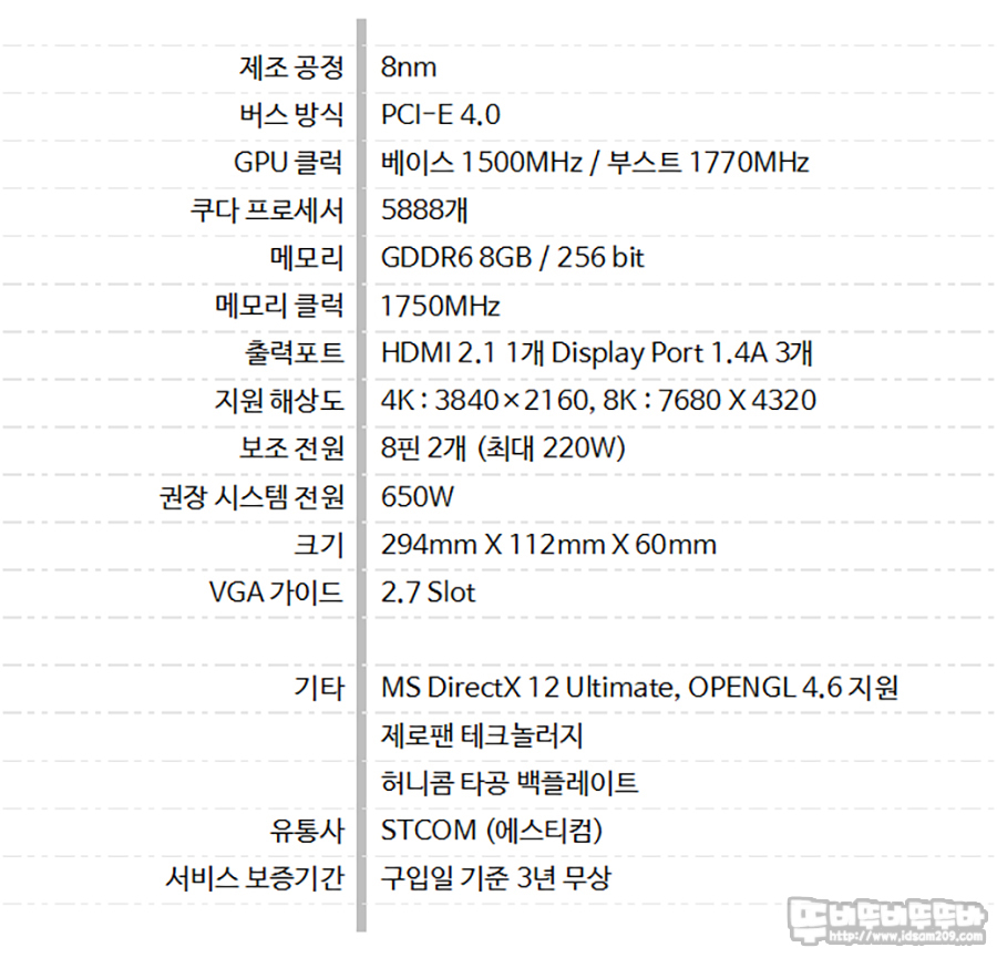 제품의 구성은 3070 VGA 본체와 6핀 커넥터 X2 → 8핀 커넥터로 변환 케이블 1개로 구성되어있으며 스펙 정보를 살펴보면....