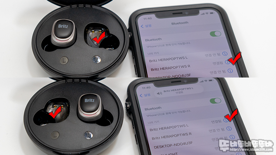 충전 케이스에서 이어버드를 꺼내면 오토페어링으로 진행되는 브리츠 HERAPOPTWS는 좌우 독립형 블루투스 이어폰으로 처음 블루투스 이어폰 페어링이 완료된 이후에는 왼쪽 이어버드를 먼저 꺼네면 왼쪽 이어버드로 페어링, 오른쪽 이어버드를 꺼내면 오른쪽 이어버드로 페어링 되는 독특함이 있습니다.