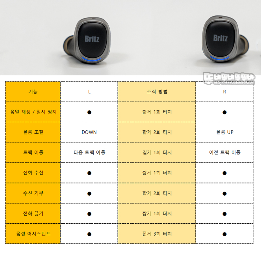 각 이어버드는 Britz 로고 부분에 내장된 터치 센서로 컨트롤하게 되며 주의할 점은 생각하는 것보다 살짝 아랫부분을 터치해야 한다는 점입니다.