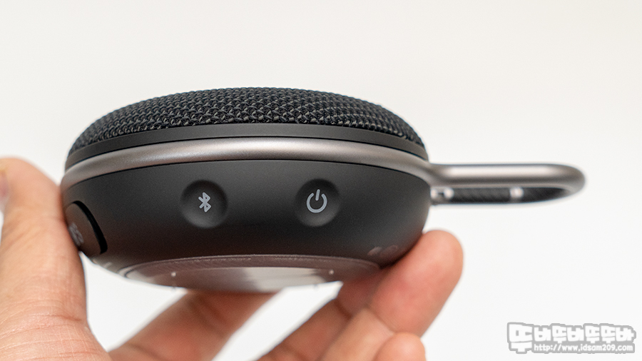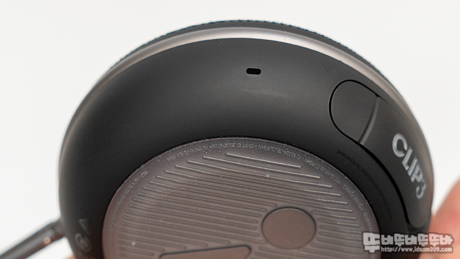 JBL CLIP3 블루투스 스피커를 살펴보면 카리비너 클립과 메탈 프레임이 일체형으로 디자인된 외각 프레임에 원형으로 디자인된 스피커가 결합된 상태로 스피커 전면에는 - / ▷ / + 컨트롤 버튼과 바닥면에는 미끄럼 방지 패드가 적용되었는데요.