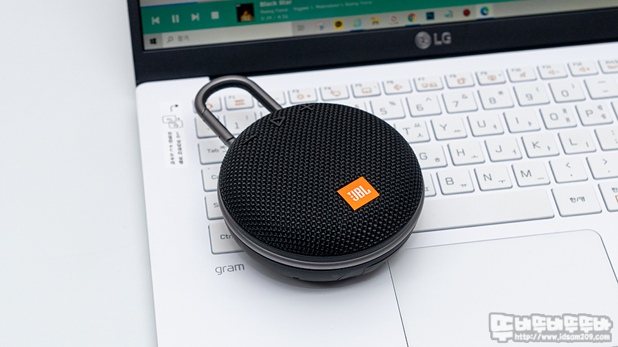 실제 소리를 100% 표현하진 못하지만 JBL Clip3 블루투스 스피커는 최대 볼륨에서도 찢어지지 않은 선명한 사운드와 강력한 중저음이 재생 시 강력한 진동을 느껴질 수 있어 노트북에 비스듬히 눕혀놓은 상태에서 음악이 재생될 때 스피커 출력의 진동으로 천천히 움직이더니 블루투스 스피커 뒷면에 진동 방지 패드 부분에 다다르자 딱 고정되는 느낌으로 작동되는군요.