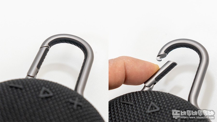 프레임 일체형으로 디자인된 카리비너 클립의 경우 금속으로만 되어있을 때 발생할 수 있는 미끄러짐을 방지하는 디자인이 적용되어있어 독특함을 느낄 수 있었습니다.