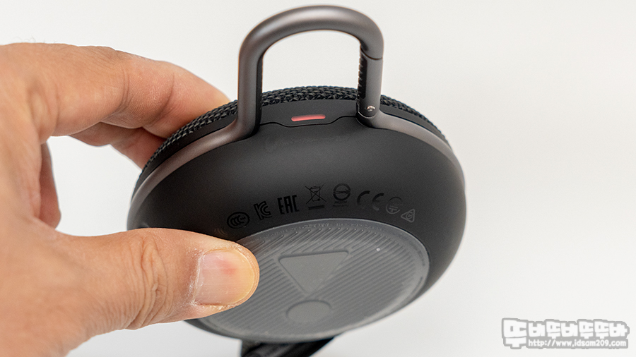 JBL Clip3 블루투스 스피커는 충전 시 상단의 LED 인디케이터가 Red 컬러로 점등되며 완충 시 LED Off로 표현됩니다.