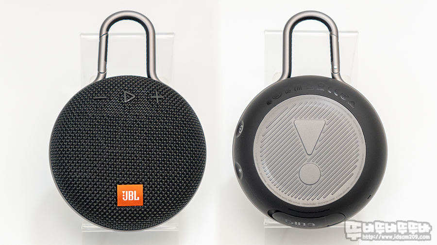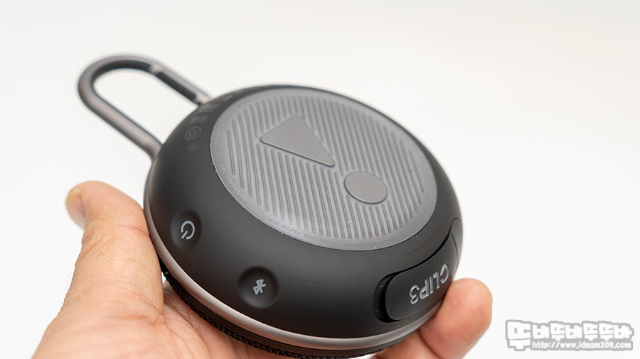 JBL CLIP3 블루투스 스피커를 살펴보면 카리비너 클립과 메탈 프레임이 일체형으로 디자인된 외각 프레임에 원형으로 디자인된 스피커가 결합된 상태로 스피커 전면에는 - / ▷ / + 컨트롤 버튼과 바닥면에는 미끄럼 방지 패드가 적용되었는데요.