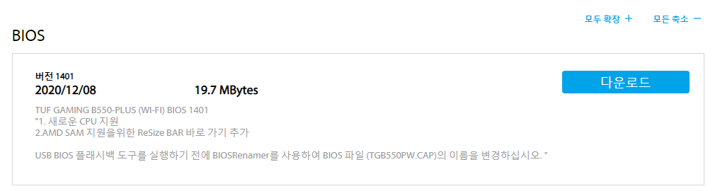 이차저차 하여 검색 후 BIOS 및 펌웨어 카테고리에서 2020/12/08에 올라온 따뜻한 신버전 1401 버전을 다운로드합니다.