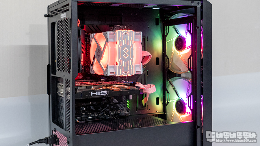 ARGB 연동은 CPU 쿨러, 메모리, 케이스 전면 쿨러 등이 동시에 적용되어 전체적으로 통일된 효과를 보여주었습니다.