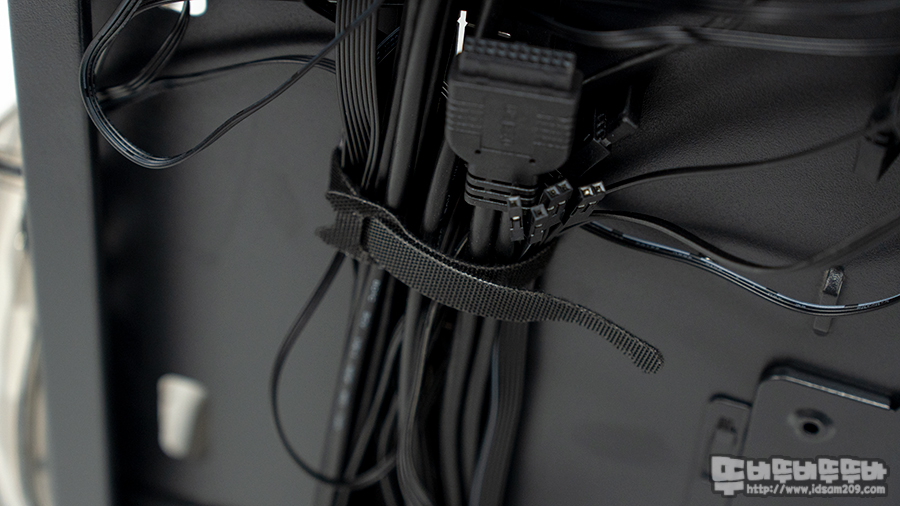 거기에 벨크로 타이가 기본으로 부착되어있어 파워 서플라이 케이블과 I/O 포트 케이블 등을 한 번에 정리할 수 있어 시스템 조립 시 더 깔끔한 느낌을 주며 샤시 후면의 깊이가 선정리에 충분한 약 22mm 두께를 제공하고 있습니다.