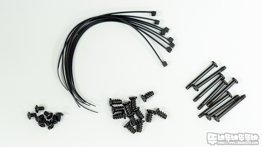 조립 부자재를 살펴보면 선정리에 필요한 케이블 타이와 수냉 라디에이터 고정나사(좌), 쿨러 샤시 고정나사(중), 케이스 내부 챔버에 120mm 쿨러 장착 시 사용하는 긴 나사 (우)