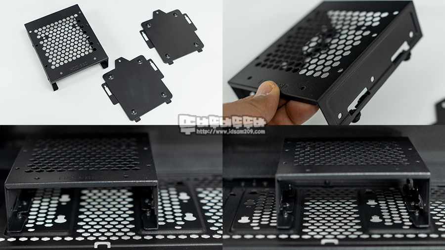HDD & SSD 가이드는 위/아래 HDD 장착 또는 위 SSD / 아래 HDD 구성으로 사용이 가능하며 위에서 설명드린 것과 같이 슬라이딩 방식으로 탈부착이 구조에 사용된 고무 와셔는 가이드 고정과 진동을 방직하는 역할을 겸하기도 합니다.