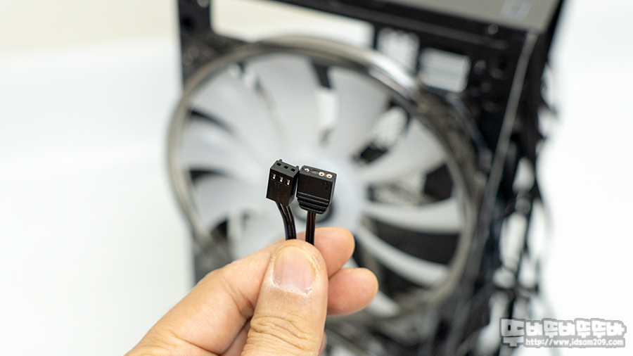 전면 200mm 쿨러의 3핀 전원 커넥터와 3핀으로 구성된 5V ARGB 커넥터 모습.