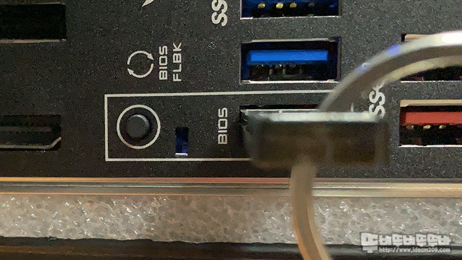 메인보드 백플레이트 하단에 BIOS FLBK 네모칸 USB 포트에 바이오스 파일이 들어있는 USB을 꼽아주고 버튼을 눌러줍니다.