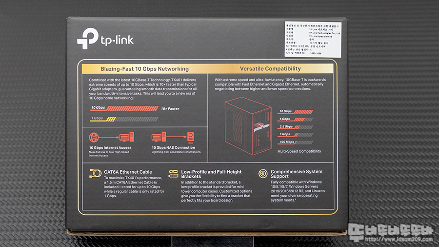 패키지 뒷면에는 제품의 성능에 대한 설명 CAT6A 케이블 제공, Low-Profile 브라켓 제공 등 제품에 대한 특징을 설명하는 내용과 측면에는 시스템 호환 정보와 스펙 정보가 인쇄되어있습니다.
