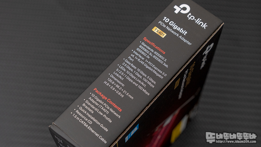 티피링크 유선랜카드 TX401 패키지에는 10기가 비트 속도와 3년 무상 보증 스티커 그리고 제품 실제 모습이 인쇄되어있는데요.