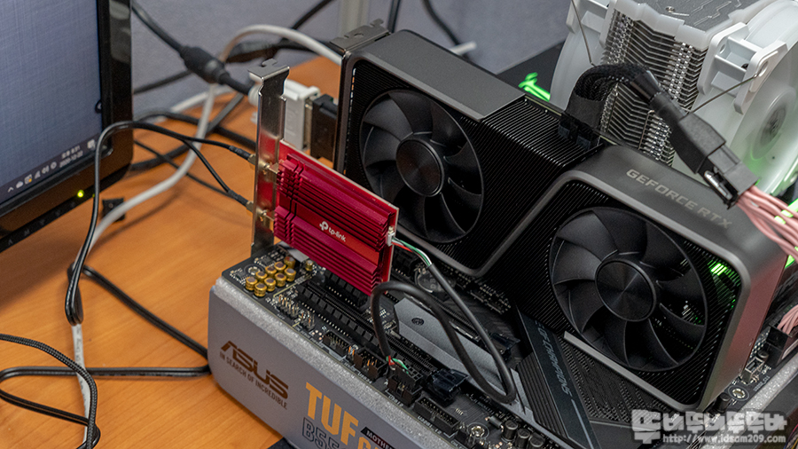 사진상 시스템에 사용된 ASUS TUF B550-PLUS Wi-Fi 메인보드의 경우 내장된 Wi-Fi 칩셋과 충돌이 발생하여 부득이하게 시스템을 해체하고 ASUS ROG STRIX X570-F GAMING 메인보드로 변경 후 오픈 테스트로 진행하였으니 참고하여주시기 바랍니다.