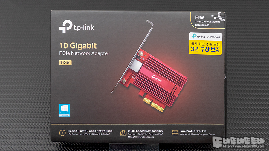 티피링크 유선랜카드 TX401 패키지에는 10기가 비트 속도와 3년 무상 보증 스티커 그리고 제품 실제 모습이 인쇄되어있는데요.