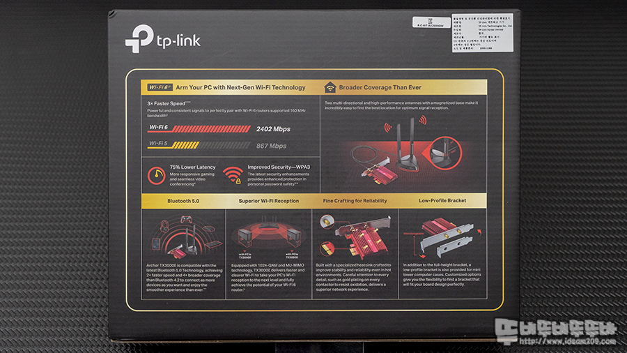TX3000E 무선 랜카드 패키지 전면에는 AX3000 속도의 Wi-Fi6 지원과 PCIe 카드와 무선 안테나가 인쇄되어 제품의 모습을 확인할 수 있으며 패키지 뒷면에는 제품의 특징이 인쇄되어있습니다.