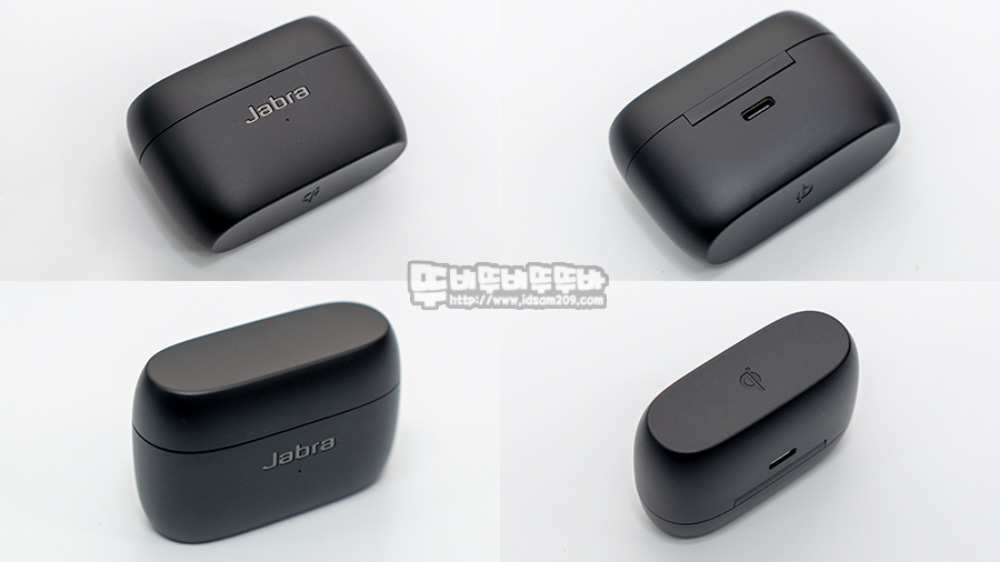 충전케이스는 슬림한 디자인으로 전면에는 Jabra 로고와 LED 인디케이터 모습을 뒷면에는 USB-C 타입 충전 단자 그리고 바닥면에는 Jabra Elite 85t의 포인트 특징인 Qi 무선 충전 마크를 확인할 수 있습니다.