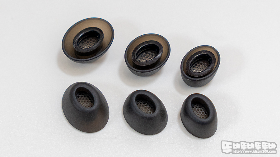 실리콘 이어팁의 사이즈를 비교해보며 기본 장착된 중간 사이즈를 제외한 큰 사이즈와 작은 사이즈가 추가로 제공되며 모양이 타원형 베이스에 이어팁 중앙 부분에 더스트 필터 구조로 디자인되어 귀지가 이어버드 안쪽으로 들어가는 것을 방지해주는 역할을 합니다.