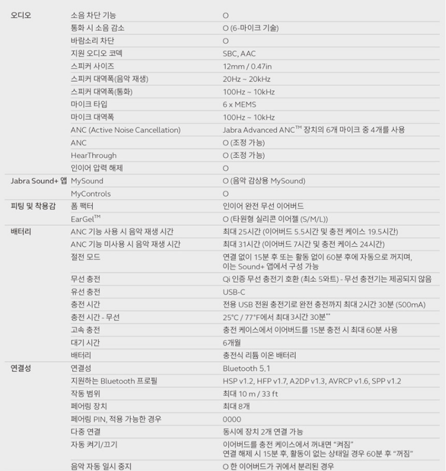 12mm 드라이브 유닛 사용 / 블루투스 버전 5.1, SBC&AAC 코덱 지원 / 6개 마이크 기술이 적용 / 액티브 노이즈 캔슬링 (ANC) 지원 / ANC 강도 조절 / 인이어 이압 해제 / Jabra Soun+ 앱 지원 / Qi 무선 충전 / 8개 멀티 페어링, 2개 멀티 포인트 지원 / IPX4 생활 방수 지원 등 을 확인할 수 있습니다.