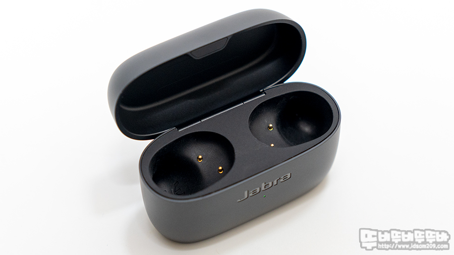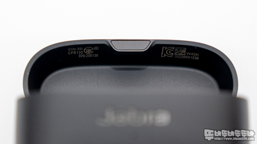충전케이스는 슬림한 디자인으로 전면에는 Jabra 로고와 LED 인디케이터 모습을 뒷면에는 USB-C 타입 충전 단자 그리고 바닥면에는 Jabra Elite 85t의 포인트 특징인 Qi 무선 충전 마크를 확인할 수 있습니다.