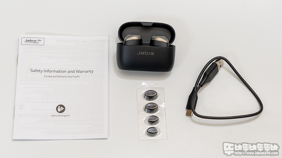 제품의 구성으로는 워런티 가이드, Jabra Elite 85t 충전 케이스와 이어버드, 여분의 실리콘 이어팁, USB-C 충전 케이블로 구성되어있습니다.