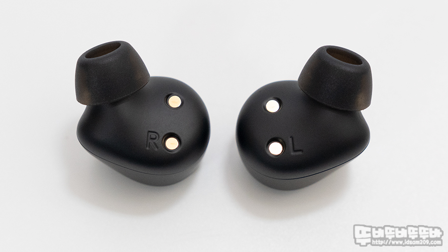 이어버드 하우징 안쪽에는 좌우를 구분하는 R, L 각인과 충전 금속 접점을 확인할 수 있습니다.