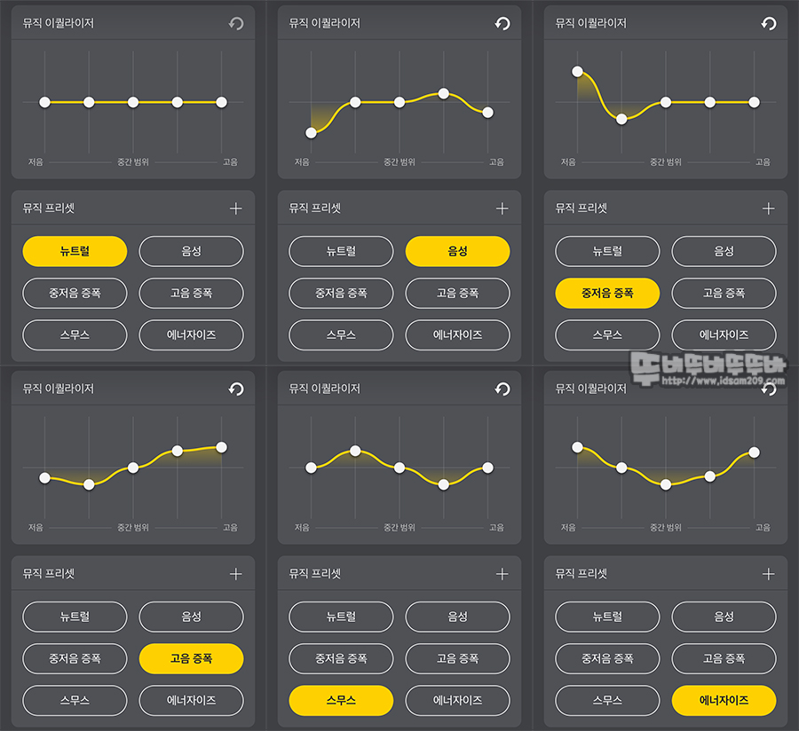 기본적인 6개의 프리셋에서 약간의 튜닝을 더하여 내가 원하는 EQ설정을 가미하여 나만의 사운드를 즐길 수 있으니 참고하시면 좋을 거 같네요.