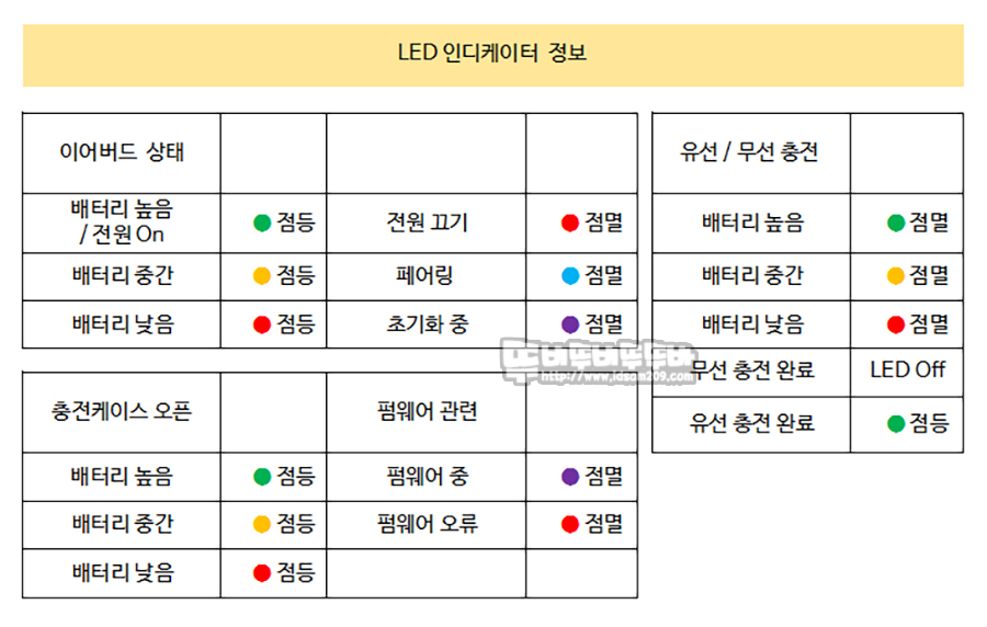 qi 인증을 받은 충전케이스로 무선 충전 시 완충까지 약 3.5시간 소요되어 유선 충전보다 시간이 조금 더 걸리는 편으로 충전 중에는 Green LED 점멸 충전이 완료되면 LED Off로 표현됩니다.