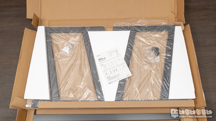 책상 상판은 모서리 부분은 플라스틱가 강도의 압축 스티로폼이 책상 모서리를 잘 보호해주고 있으며 상판 앞, 뒤, 모서리 부분을 스티로폼으로 감싸는 형태로 포장이 되어있음을 확인할 수 있습니다.