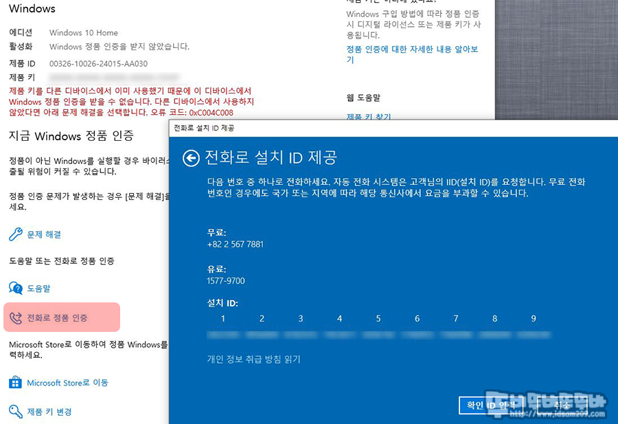 시작 - 톱니바퀴 설정 - 정품인증 - 전화로 정품 인증 메뉴를 통해 고객지원센터 전화 상담으로 이전 시스템의 인증을 수동으로 해제하고 새로운 8 단계의 코드를 부여받아 받아 정품인증으로 사용할 수 있었습니다.