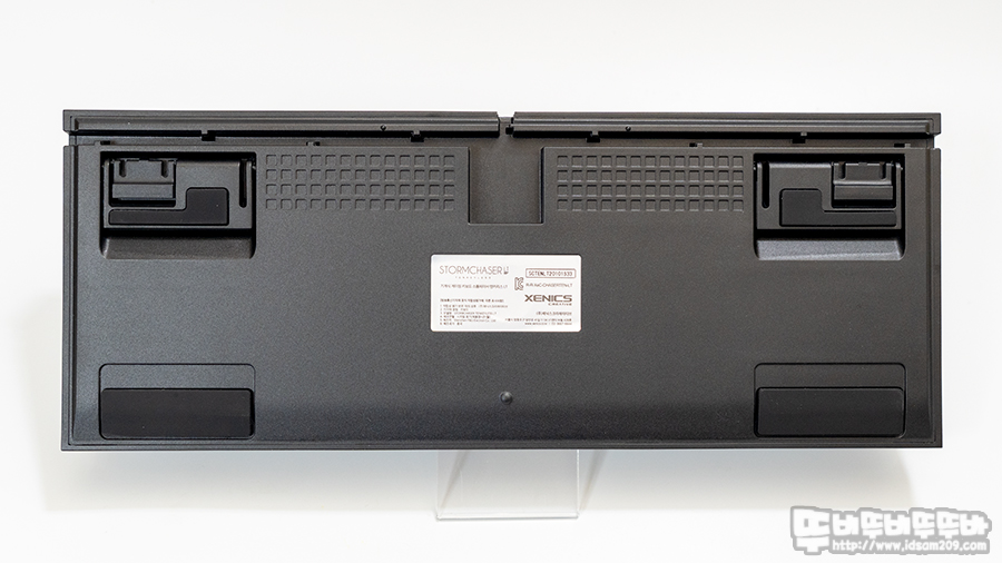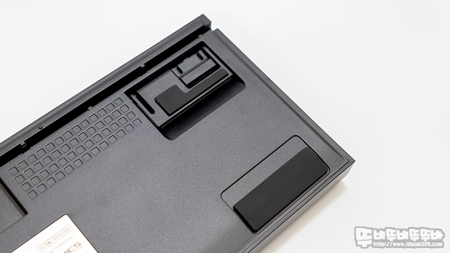 키보드의 하판을 살펴보면 상단에 3 Way 방향으로 케이블을 정리할 수 있는 홈과 아래 부분과 높이 조절 다리 부분에 미끄럼 방지 패드가 부착된 것을 확인할 수 있는데요.