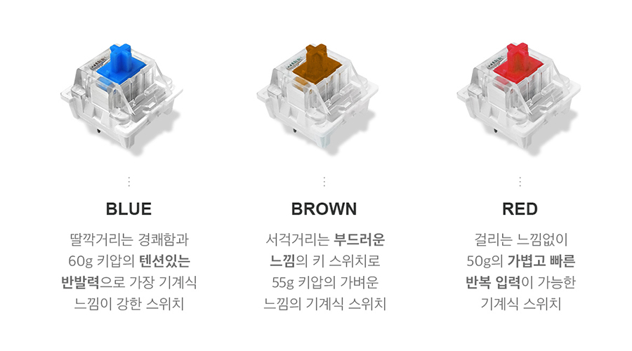 오테뮤 스위치의 경우 체리와 비슷한 키압의 청축과 갈축 그리고 체리 적축보다는 키압이 살짝 높은 적축이 사용되고 있는데요.