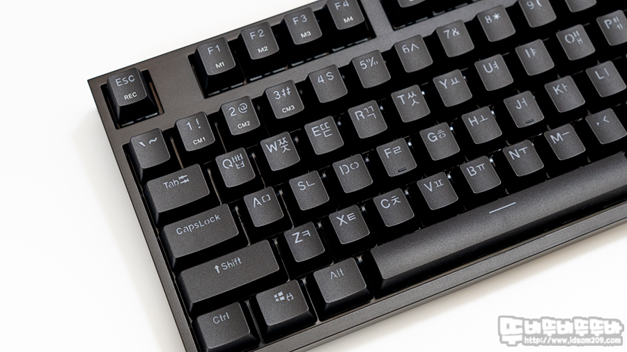키캡의 각인은 스위치의 역방향 구조에 따라 상단 부분에 위치하는 디자인이 적용되었습니다.