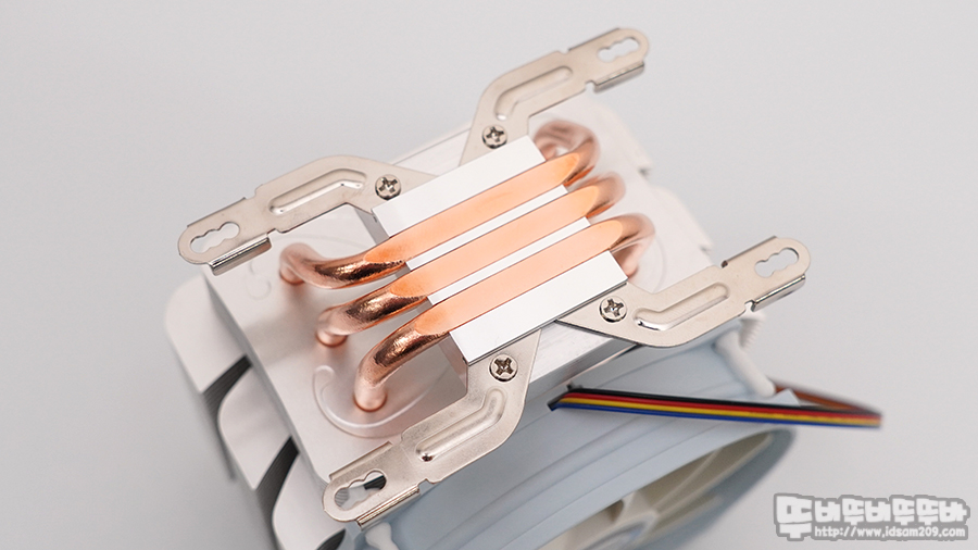 바닥면을 살펴보면 구리 재질의 히트파이프가 CPU 히트 스프레더에 직접 맞닿아 열을 빠르게 전달할 수 있게 디자인된 접촉면을 확인할 수 있습니다.